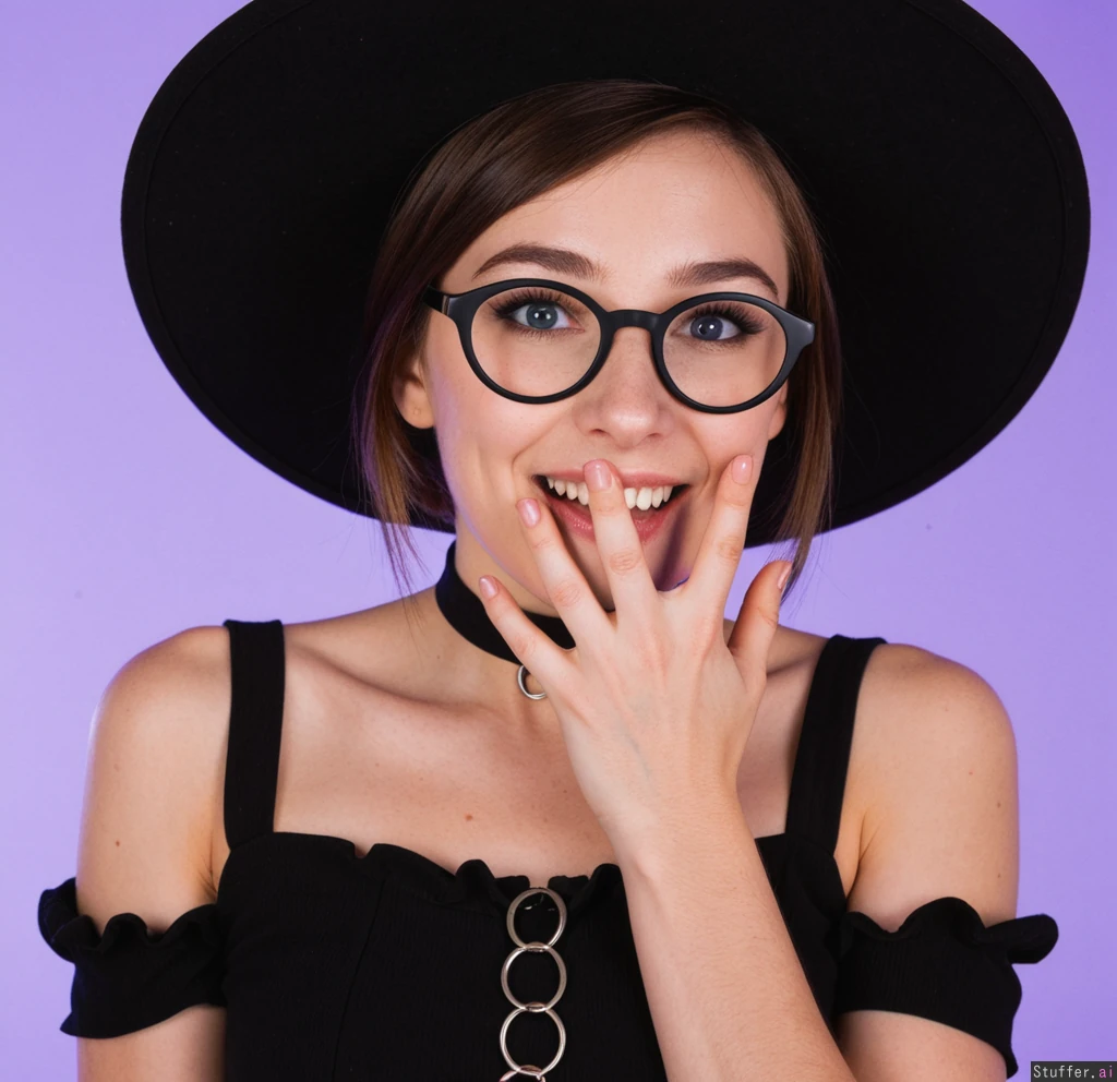 Cute Witch girl with short brown hair and blue eyes Big round glasses black cotton tunic sundress with clasps purple background Black witch hat thin choker exposed shoulders ((innocent:1.2)) ((smiling_eyes:1.3)) ((giggling:0.5)) ((shocked:1.2)) ((hand_over_mouth:1.4)) ((cool_undertone)) ((Natural:1.5))