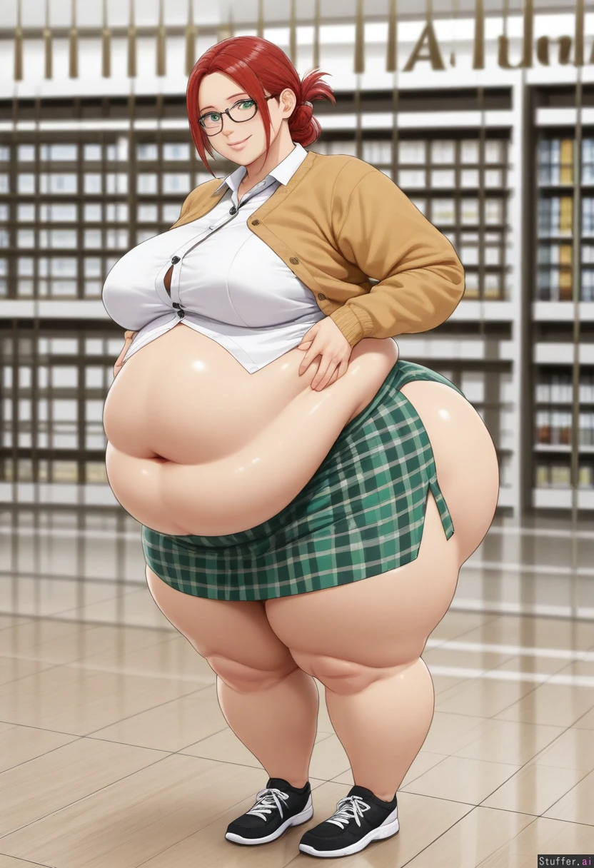 ((Photorealistic)), ((photo realism)), highly detailed, 8k, ((enormous fat belly:1.3)), ((fully clothed:1.9)) Clothes cover belly, dressed, An extremely cute 18 years old, girl, very long red hair, hair tied in messy bunches, hypnotic green eyes, cute smile, ((Wide hips:1.8)), ((Fat belly:1.9)), ((fat hips)), ((fat ass:1.8)), ((fat legs:1.7)), ((fat heavy breasts)), Library, standing, Geeky librarian style, checked skirt, skirt covers belly, dressed, cardigan, blues and greens, fabric stretched tight, black framed glasses, sneakers, ((fully clothed)), ((clothes cover belly)),