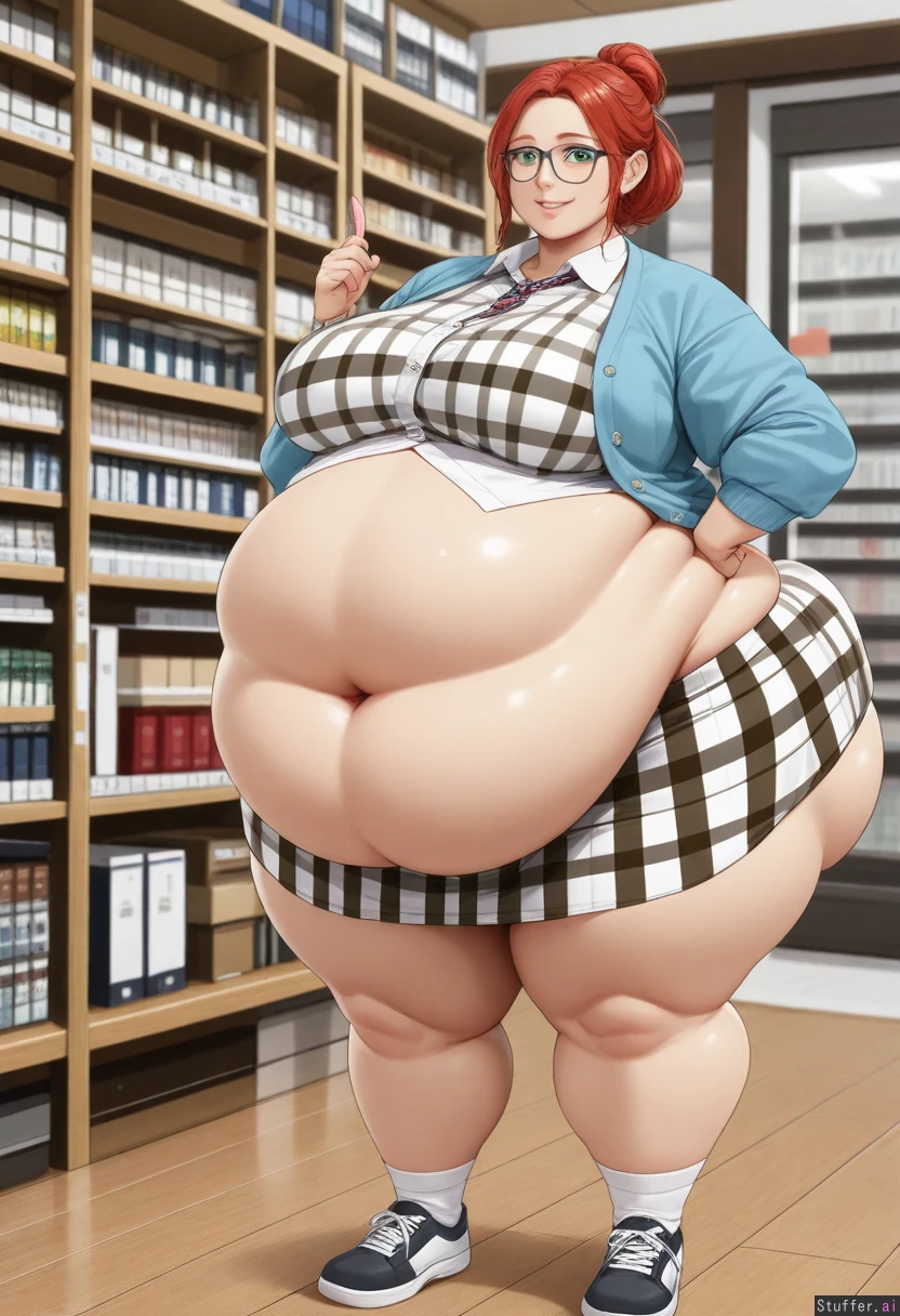 ((Photorealistic)), ((photo realism)), highly detailed, 8k, ((enormous fat belly:1.3)), ((fully clothed:1.9)) Clothes cover belly, dressed, An extremely cute 18 years old, girl, very long red hair, hair tied in messy bunches, hypnotic green eyes, cute smile, ((Wide hips:1.8)), ((Fat belly:1.9)), ((fat hips)), ((fat ass:1.8)), ((fat legs:1.7)), ((fat heavy breasts)), Library, standing, Geeky librarian style, checked skirt, skirt covers belly, dressed, cardigan, blues and greens, fabric stretched tight, black framed glasses, sneakers, ((fully clothed)), ((clothes cover belly)),