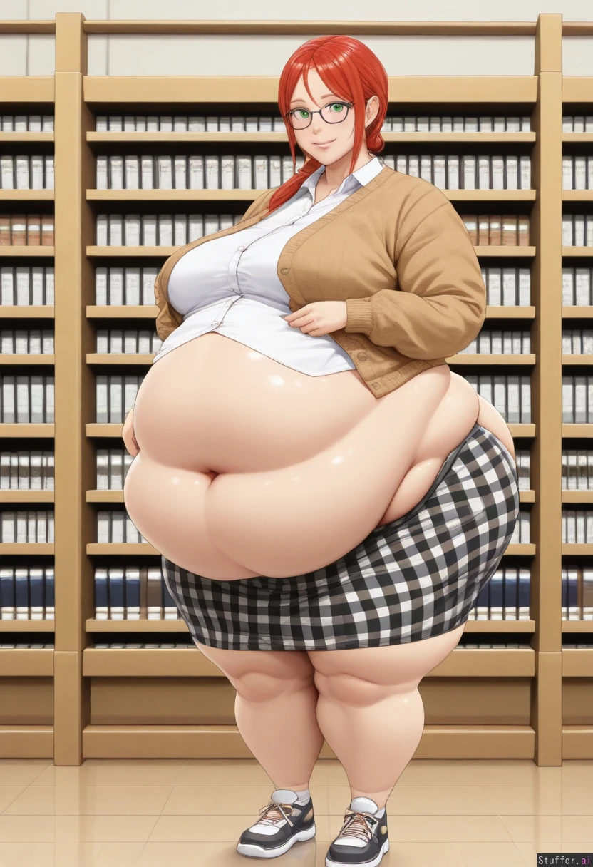 ((Photorealistic)), ((photo realism)), highly detailed, 8k, ((enormous fat belly:1.3)), ((fully clothed:1.9)) Clothes cover belly, fully dressed, covered, An extremely cute 18 years old, girl, very long red hair, hair tied in messy bunches, hypnotic green eyes, cute smile, ((Wide hips:1.8)), ((Fat belly:1.9)), ((fat hips)), ((fat ass:1.8)), ((fat legs:1.7)), ((fat heavy breasts)), Library, standing, Geeky librarian style, checked skirt, skirt covers belly, dressed, cardigan, blues and greens, fabric stretched tight, black framed glasses, sneakers, ((fully clothed)), ((clothes cover belly)),