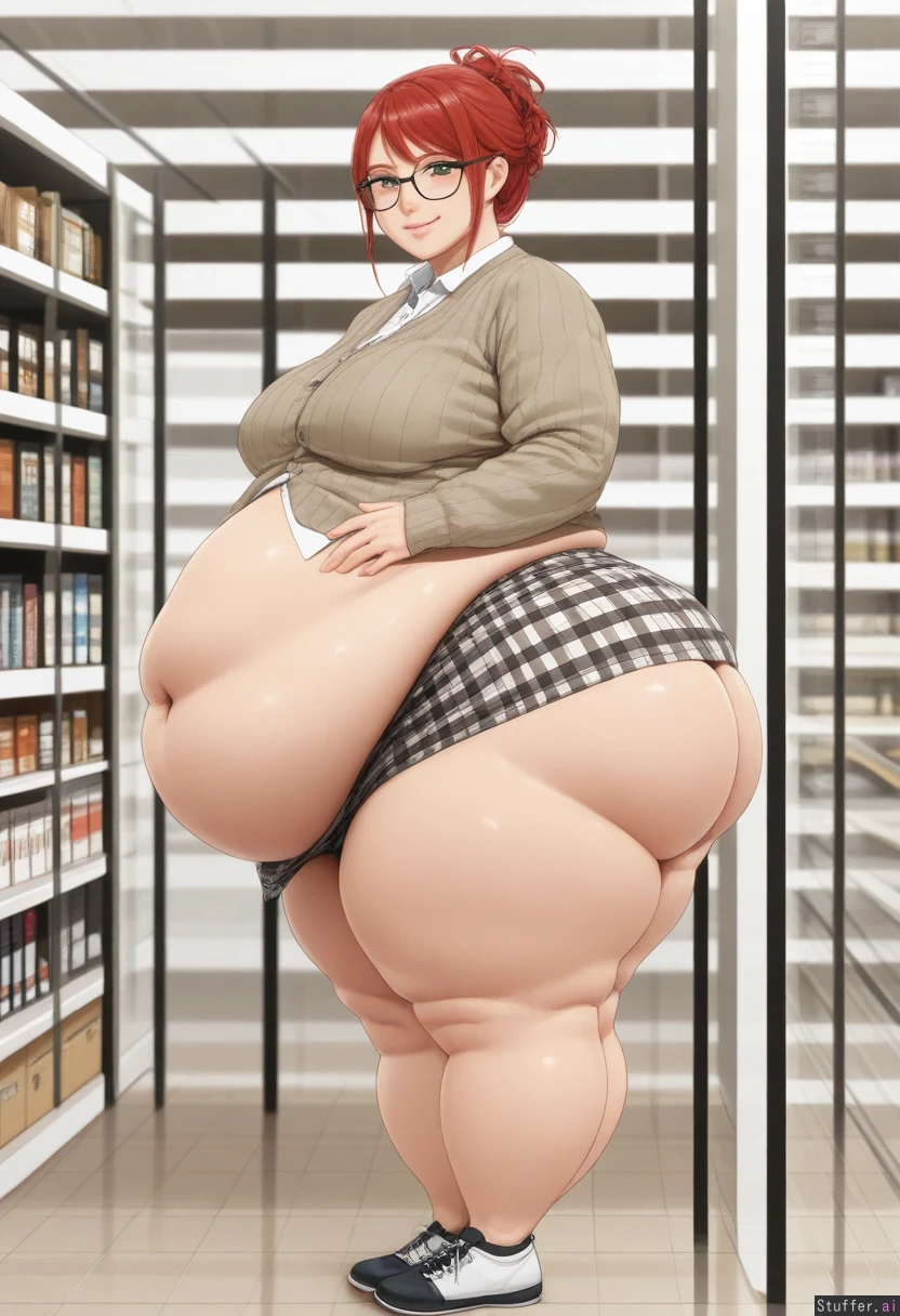 ((Photorealistic)), ((photo realism)), highly detailed, 8k, ((enormous fat belly:1.3)), ((fully clothed:1.9)) Clothes cover belly, fully dressed, covered, An extremely cute 18 years old, girl, very long red hair, hair tied in messy bunches, hypnotic green eyes, cute smile, ((Wide hips:1.8)), ((Fat belly:1.9)), ((fat hips)), ((fat ass:1.8)), ((fat legs:1.7)), ((fat heavy breasts)), Library, standing, Geeky librarian style, checked skirt, skirt covers belly, dressed, cardigan, blues and greens, fabric stretched tight, black framed glasses, sneakers, ((fully clothed)), ((clothes cover belly)),