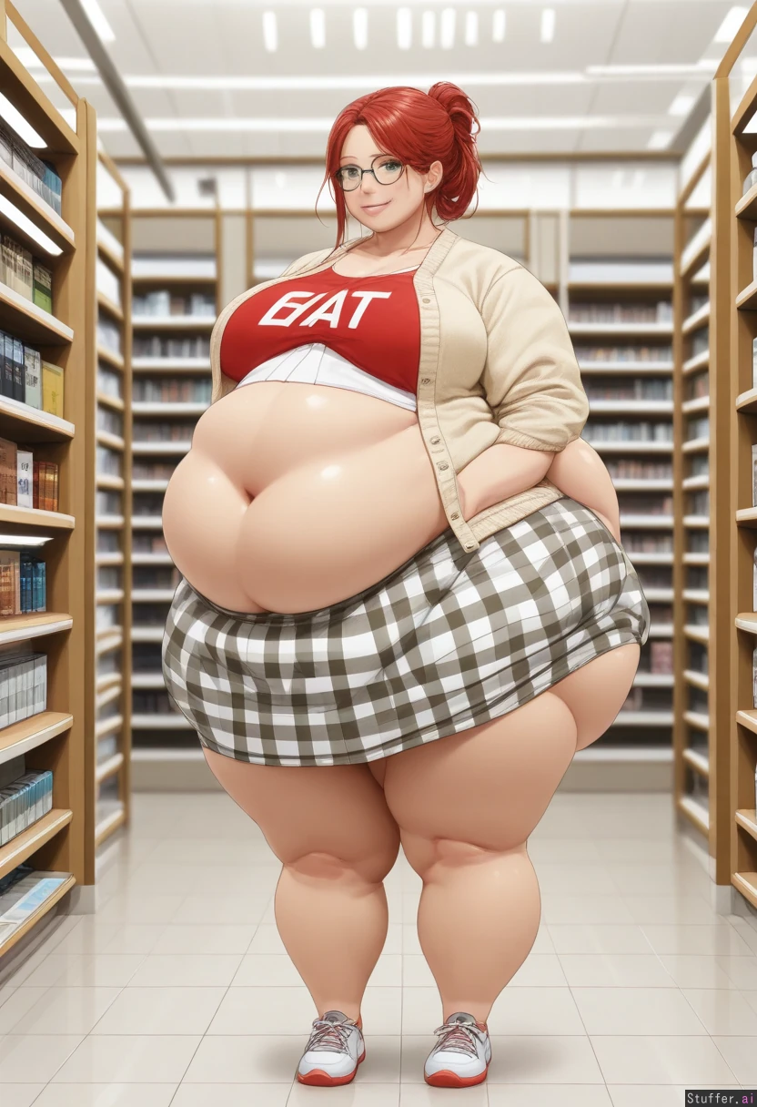 ((Photorealistic)), ((photo realism)), highly detailed, 8k, ((enormous fat belly:1.3)), ((fully clothed:1.9)) Clothes cover belly, fully dressed, covered, An extremely cute 18 years old, girl, very long red hair, hair tied in messy bunches, hypnotic green eyes, cute smile, ((Wide hips:1.8)), ((Fat belly:1.9)), ((fat hips)), ((fat ass:1.8)), ((fat legs:1.7)), ((fat heavy breasts)), Library, standing, Geeky librarian style, checked skirt, skirt covers belly, dressed, cardigan, blues and greens, fabric stretched tight, black framed glasses, sneakers, ((fully clothed)), ((clothes cover belly)),