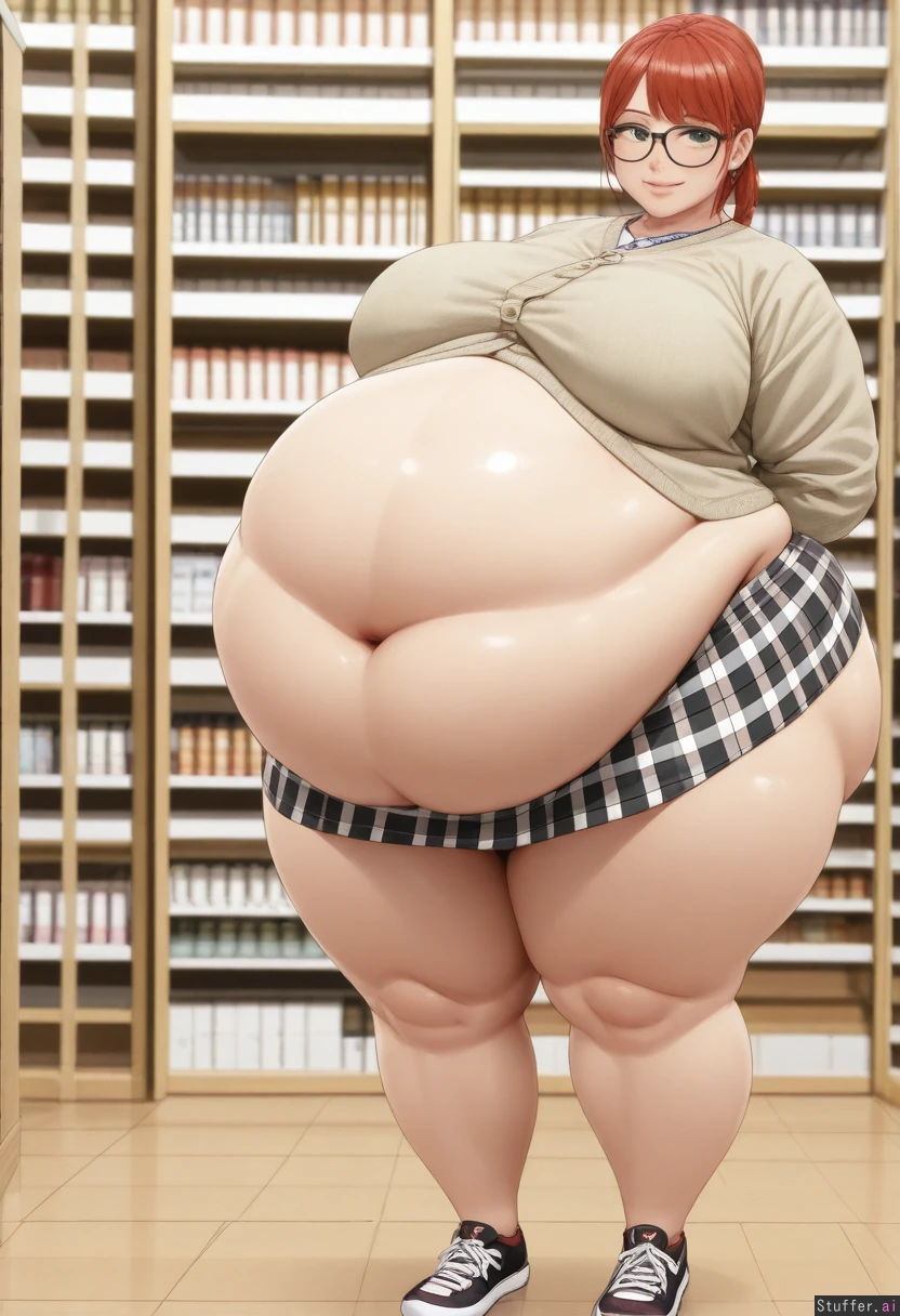 ((Photorealistic)), ((photo realism)), highly detailed, 8k, ((enormous fat belly:1.3)), ((fully clothed:1.9)) Clothes cover belly, fully dressed, covered, An extremely cute 18 years old, girl, very long red hair, hair tied in messy bunches, hypnotic green eyes, cute smile, ((Wide hips:1.8)), ((Fat belly:1.9)), ((fat hips)), ((fat ass:1.8)), ((fat legs:1.7)), ((fat heavy breasts)), Library, standing, Geeky librarian style, checked skirt, skirt covers belly, dressed, cardigan, blues and greens, fabric stretched tight, black framed glasses, sneakers, ((fully clothed)), ((clothes cover belly)),
