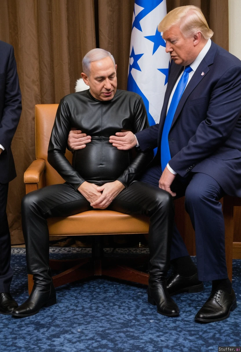 Old wrinkly Donald Trump sat naked, crying, Netanyahu stood beside him wearing a leather cat suit