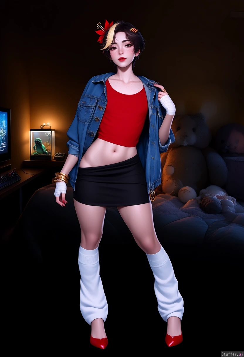 Androgynous femboy young man, 22 years old, slim body with wide hips and thick soft thighs, pale skin, smooth hairless torso, delicate facial features, light freckles across his cheeks, dark brown eyes, thin eyebrows, soft lips. Short slightly wavy dark brown hair with a blonde streak in the front. Wearing a red crop top, oversized denim jacket, black pencil skirt, white leg warmers, and red pointed high heels. Bandages wrapped around his forearms. Accessories include red hairpins, a red flower hair clip, and gold bracelets. Light makeup with subtle eyeliner and red lipstick. Confident and playful expression, slightly leaning pose. Cozy bedroom background with plush toys on a large tidy bed, warm lighting, a gaming console near the TV, and a desk with a small aquarium containing a turtle.