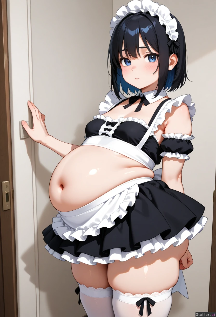 1 Boy Gender: Male pregnancy Hair: (Short straight black hair with blue streaks) Eyes: (Blue) Features: (Round and plump butt, Small breasts flat, Big round belly) Maid_costume, White stockings and lace,