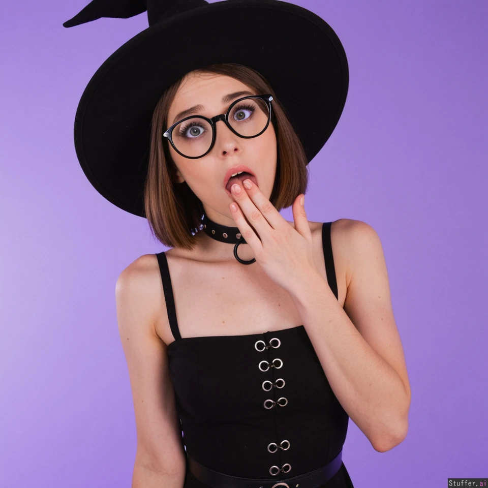 Cute Witch girl with blue eyes bobcut brown hair dominatrix Big round glasses black cotton tunic sundress with clasps purple background Black witch hat thin choker exposed shoulders ((innocent:1.2)) ((excited:1.2)) fascinated shocked ((giggling:0.7)) ((hand_over_mouth:1.3)) ((cool_skin:1.2)) ((Natural:1.5))
