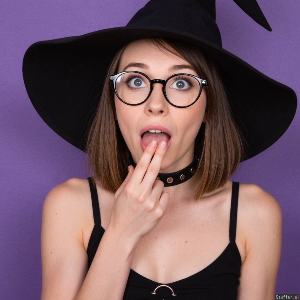 Cute Witch girl with blue eyes bobcut brown hair dominatrix Big round glasses black cotton tunic sundress with clasps purple background Black witch hat thin choker exposed shoulders ((innocent:1.2)) ((excited:1.2)) fascinated shocked ((giggling:0.7)) ((hand_over_mouth:1.3)) ((cool_skin:1.2)) ((Natural:1.5))