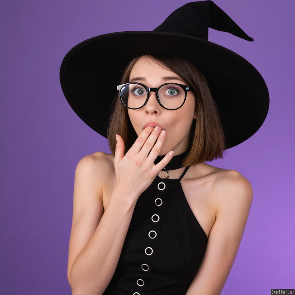 Cute Witch girl with blue eyes bobcut brown hair dominatrix Big round glasses black cotton tunic sundress with clasps purple background Black witch hat thin choker exposed shoulders ((innocent:1.2)) ((excited:1.2)) fascinated shocked ((giggling:0.9)) ((hand_over_mouth:1.3)) ((cool_skin:1.2)) ((Natural:1.5))
