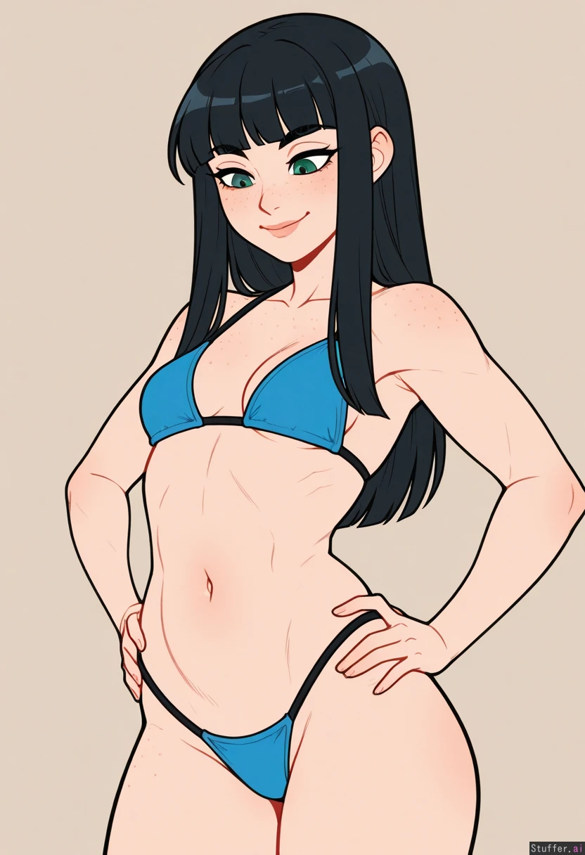 (Kinkymation(artist):0.5), (pudgeruffian(artist):0.3), Beige background, 1girl, solo, (simple style), ((less detail)), flat colors, black hair, long hair, blunt bangs, round eyes, green eyes, eye liner, cute face, freckles, looking down at self, smiling, light skin, hands on hips slim, toned belly, (Blue_bikini, black thong), (tight clothes) Small breasts, (Expanding breasts:0.6), ((eyes open)),