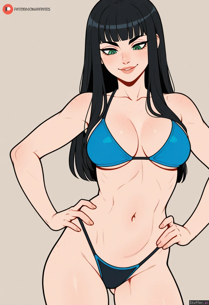 (Kinkymation(artist):0.5), (pudgeruffian(artist):0.3), Beige background, 1girl, solo, (simple style), ((less detail)), flat colors, black hair, long hair, blunt bangs, round eyes, green eyes, eye liner, cute face, freckles, looking down at self, smiling, light skin, hands on hips slim, toned belly, (Blue_bikini, black thong), (tight clothes) (Expanding breasts:0.5), ((eyes open)),