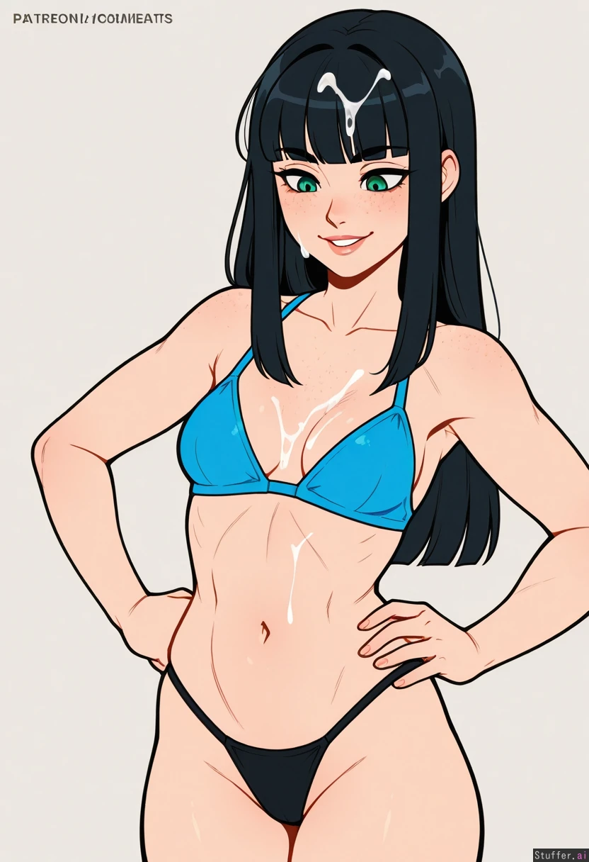 (Kinkymation(artist):0.5), (pudgeruffian(artist):0.3), Beige background, 1girl, solo, (simple style), ((less detail)), flat colors, black hair, long hair, blunt bangs, round eyes, green eyes, eye liner, cute face, freckles, looking down at self, smiling, light skin, hands on hips slim, toned belly, (Blue_bikini, black thong), (tight clothes) Small breasts, (Expanding breasts:0.1), ((eyes open)), ((cum, bukkake))