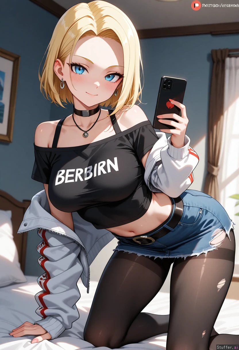 ai_generated all_fours android_18 ass bangs belt black_pantyhose black_shirt blonde_hair blue_eyes blue_skirt blush breasts cellphone closed_mouth denim denim_skirt dragon_ball dragon_ball_super dragon_ball_z ear_piercing earrings female from_behind holding holding_phone indoors jacket jewelry kermixx long_sleeves looking_at_viewer looking_back medium_breasts off_shoulder pantyhose parted_bangs patreon_logo patreon_username phone piercing seductive_smile shiny shiny_clothes shirt short_hair short_sleeves skirt smartphone smile solo thighs torn_clothes torn_pantyhose watermark white_jacket