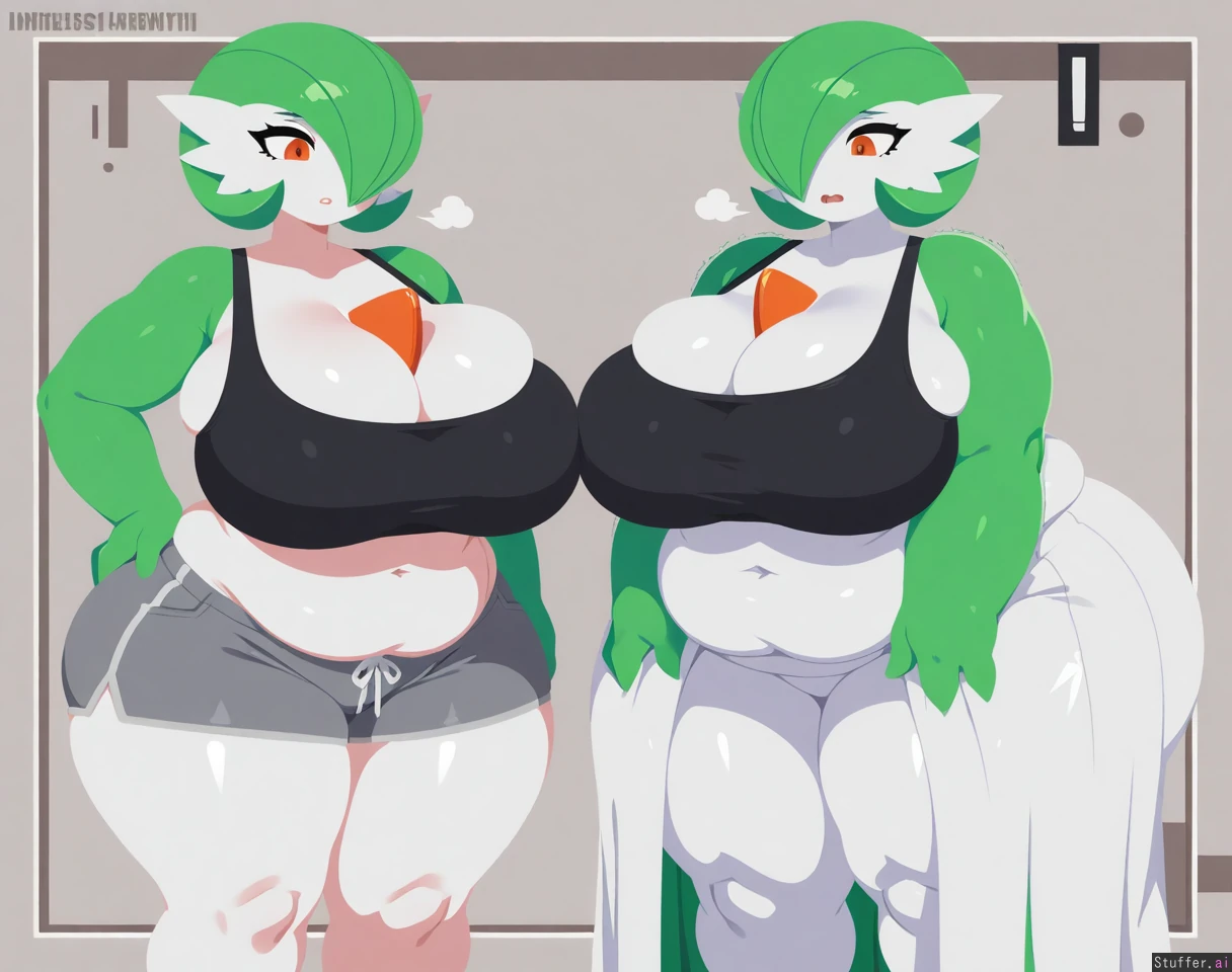 best quality, high rating, (solo:1.4, alone), mature, (((Gardevoir))), green gardevoir, milf, (growth:2), Vanripper(artist), debyjull(artist), merunyaa(artist), cross-crescent(artist), wamudraws(artist), kipteitei, ((lineless:1.8)), ((pixel art)), vibrant colors, hard shading, (((black sports bra, grey sweat shorts))), unrealistic proportions, Gym setting, ((detailed background)), (breathing heavily:1.3), ((mouth open:1.6)), neutral expression, (Hyper_obese:1.1), (extremely wide obese body), (rounded face), ((fat face:1.6)), (double chin), Fat Arms, (gigantic_fat_thighs), (colossal_breasts:1.8), (more_breast_than_woman), ((hyper busty)), (fat_legs:1.4), (enormous wide hips:1.2), gigantic thighs), (gigantic ass:1.5), (gigantic hips:1.3), (love handles:1.4), cleavage, (skindentation), (narrow waist), (fat belly rolls:1.4), (round lower belly:1.4), (hanging belly rolls:1.4), (fat breasts:2.0), standing, curvy body, voluptuous figure, hourglass figure, breasts bouncing, fat jiggling, (bursting breasts, undersized clothes, breast expansion, wardrobe malfunction, taut clothes),