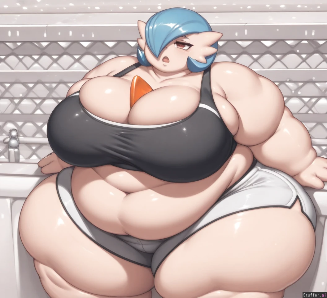 best quality, high rating, (solo:1.4, alone), mature, (((Gardevoir))), green gardevoir, milf, (growth:2), Vanripper(artist), debyjull(artist), merunyaa(artist), cross-crescent(artist), wamudraws(artist), kipteitei, ((lineless:1.8)), ((pixel art)), vibrant colors, hard shading, (((black sports bra, grey sweat shorts))), unrealistic proportions, wide shot perspective, fully body shot, Gym setting, ((detailed background)), (breathing heavily:1.3), ((mouth open:1.6)), neutral expression, sitting, too fat to stand, (Hyper_obese:1.1), (extremely wide obese body), (rounded face), ((fat face:1.6)), (double chin), Fat Arms, (gigantic_fat_thighs), (colossal_breasts:1.8), (more_breast_than_woman), ((hyper busty)), (fat_legs:1.4), (enormous wide hips:1.2), gigantic thighs), (gigantic ass:1.5), (gigantic hips:1.3), (love handles:1.4), cleavage, (skindentation), (narrow waist), (fat belly rolls:1.4), (round lower belly:1.4), (hanging belly rolls:1.4), (fat breasts:2.0), standing, curvy body, voluptuous figure, hourglass figure, breasts bouncing, fat jiggling, (bursting breasts, undersized clothes, breast expansion, wardrobe malfunction, taut clothes),