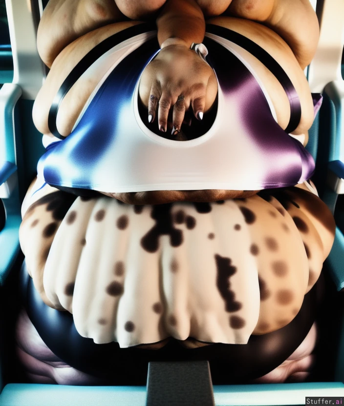 View from above, ((fully clothed)) Sitting on public transport ((Enormous fat belly:1.9)), ((morbidly obese1.9)), ((massive fat belly1.9)), White jeans Pink floral blouse Large blue eyes Long flowing wavy brown hair ((Extremely fat hips:1.7)), ((mega_wide_lower_body:1.7)).