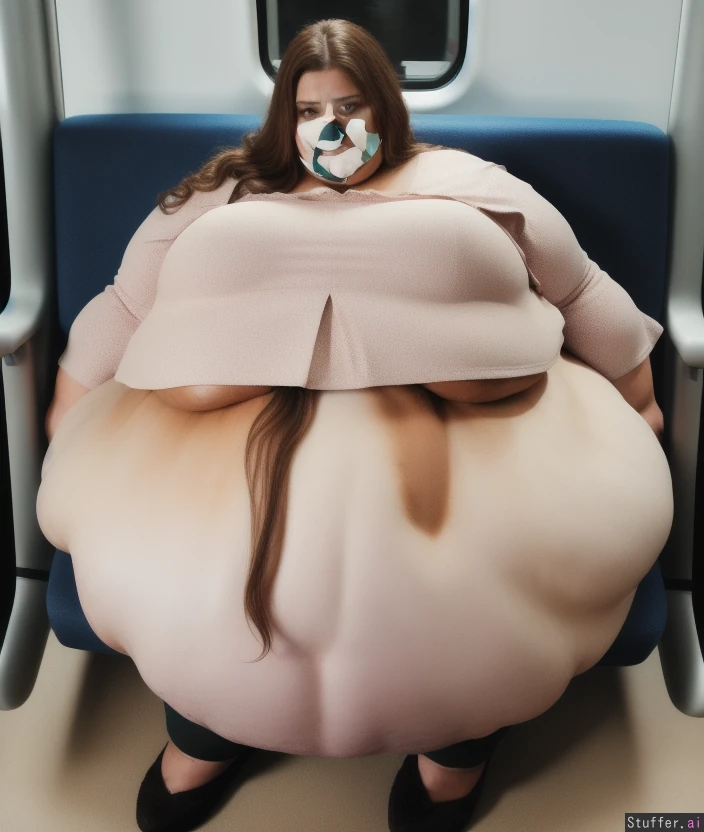 View from above, ((fully clothed)) Sitting on public transport ((Enormous fat belly:1.9)), ((morbidly obese1.9)), ((massive fat belly1.9)), White jeans Pink floral blouse Large blue eyes Long flowing wavy brown hair ((Extremely fat hips:1.7)), ((mega_wide_lower_body:1.7)).