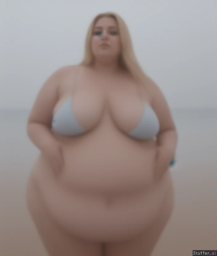 Photo realistic, ssbbw, extremely fat stuffed belly, highly detailed,fully clothed, big tits, cleavage, under boob, tight blue bikini, belly hang, realistic lighting, at the beach
