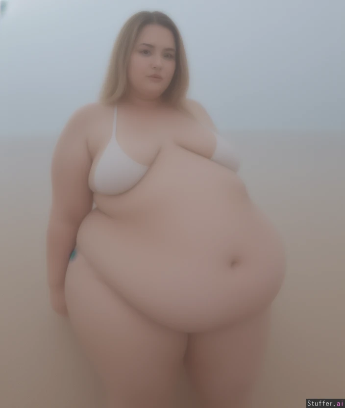 Photo realistic, ssbbw, extremely fat stuffed belly, highly detailed,fully clothed, big tits, cleavage, under boob, tight blue bikini, belly hang, realistic lighting, at the beach