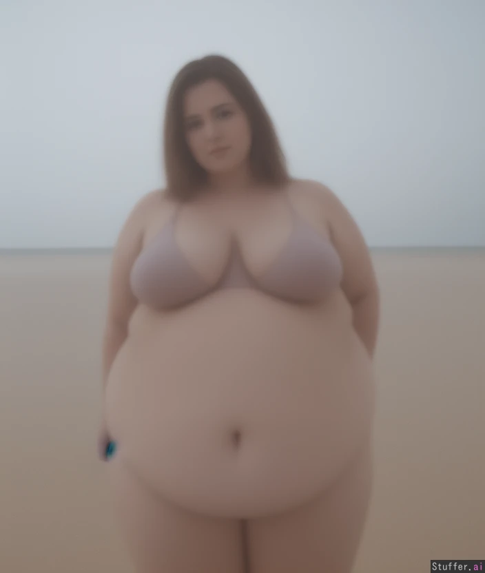 Photo realistic, ssbbw, extremely fat stuffed belly, highly detailed,fully clothed, big tits, cleavage, under boob, tight blue bikini, belly hang, realistic lighting, at the beach