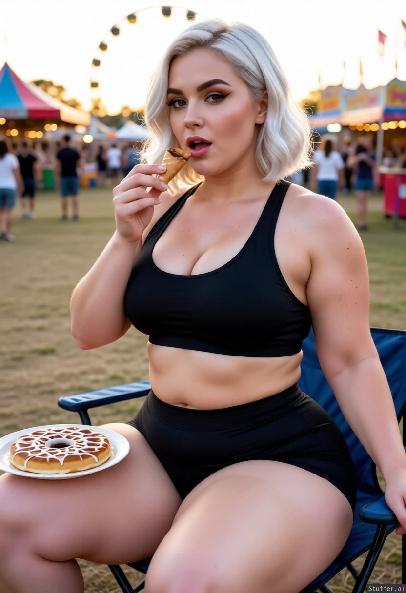 fit_female, platinum_blonde, wavy_bob, weight_gain:1.5, athletic_female, stocky, thicc, hourglass, muscle, distant, full body view, pale_skin, morning, sitting, festival, state_fair, ((eyeliner, lipstick, cute, pretty, beautiful, makeup, lightbrown_eyebrows,))looking_at_viewer, slightly_tight_clothing, black_sports_bra, black_gym_shorts, hourglass, curvy, toned belly, soft, slight muscles, (((slimthick, abs))) (hourglass_body) eating_funnel_cake, wide_hips wide_thighs wide_ass, large_breasts