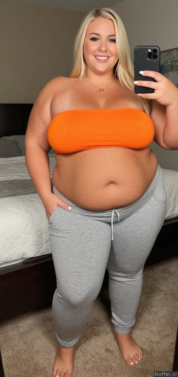 Beautiful 25 yo American tan blonde girl, perfect influencer model face (((tight tube top and tight gray sweatpants:1.4))), smirking, confidence, necklace, taking selfie in bedroom, grabbing and touching belly (Full body view) (((Wide hips))) Plump fat chubby arms SSBBW ((huge fat tan blob)) (huge tan Cleavage:1.4) ( fat tan chubby bloated belly:1.4), long white toenails