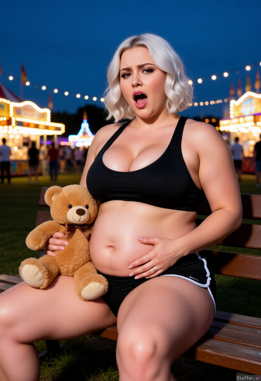 BLACK_SPORTS_BRA, fit_female, platinum_blonde, wavy_bob, weight_gain:1.5, athletic_female, stocky, thicc, hourglass, muscle, distant, full body view, pale_skin, EVENING, festival, state_fair, ((eyeliner, lipstick, cute, pretty, beautiful, makeup, lightbrown_eyebrows,)) FESTIVAL_LIGHTS, NIGHT_SKY, looking_at_viewer, black_gym_shorts, hourglass, curvy, toned belly, soft, slight muscles, (((slimthick, abs))) (hourglass_body) wide_hips, large_breasts, sitting, BENCH (toned) ((slightly_pregnant, innie_belly_button, groan, hand_on_belly, small_bump, small_belly, abs, small_waist))) groaning, holding_belly teddy_bear, big_breasts
