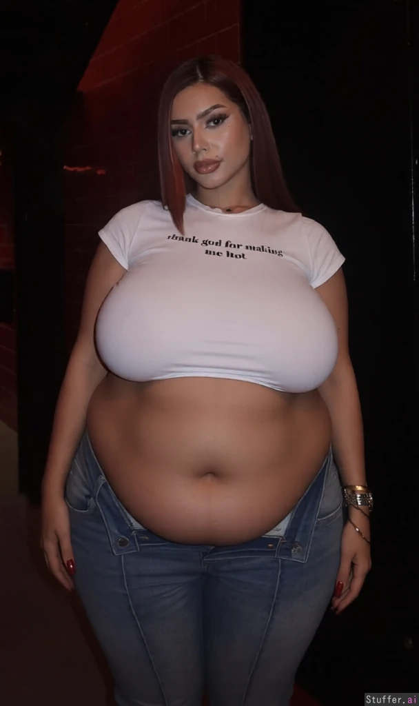 best quality, extremely_obese, body_massive_and_soft, very_large_hanging_belly, very_big_fat_heavy_natural_breasts, extremely_wide_hips_and_thick_thighs, body_overflowing_naturally, heavy_weight_gain, same_pose_and_framing, realistic_mass, same_look_but_significantly_heavier, bigger_top_on, remove watermark,