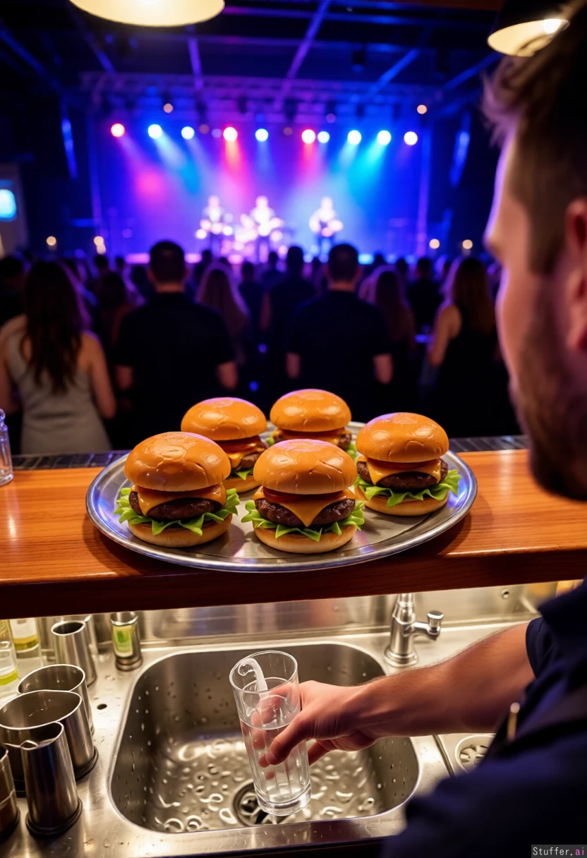 first_person_view, speaking to bartender from other side of counter, bartender washing glass, bartender_across_counter, bartender_looking_at_viewer, male_bartender, bartender_handing_viewer_tray, tray of 5 burgers, at concert, at bar at concert, evening