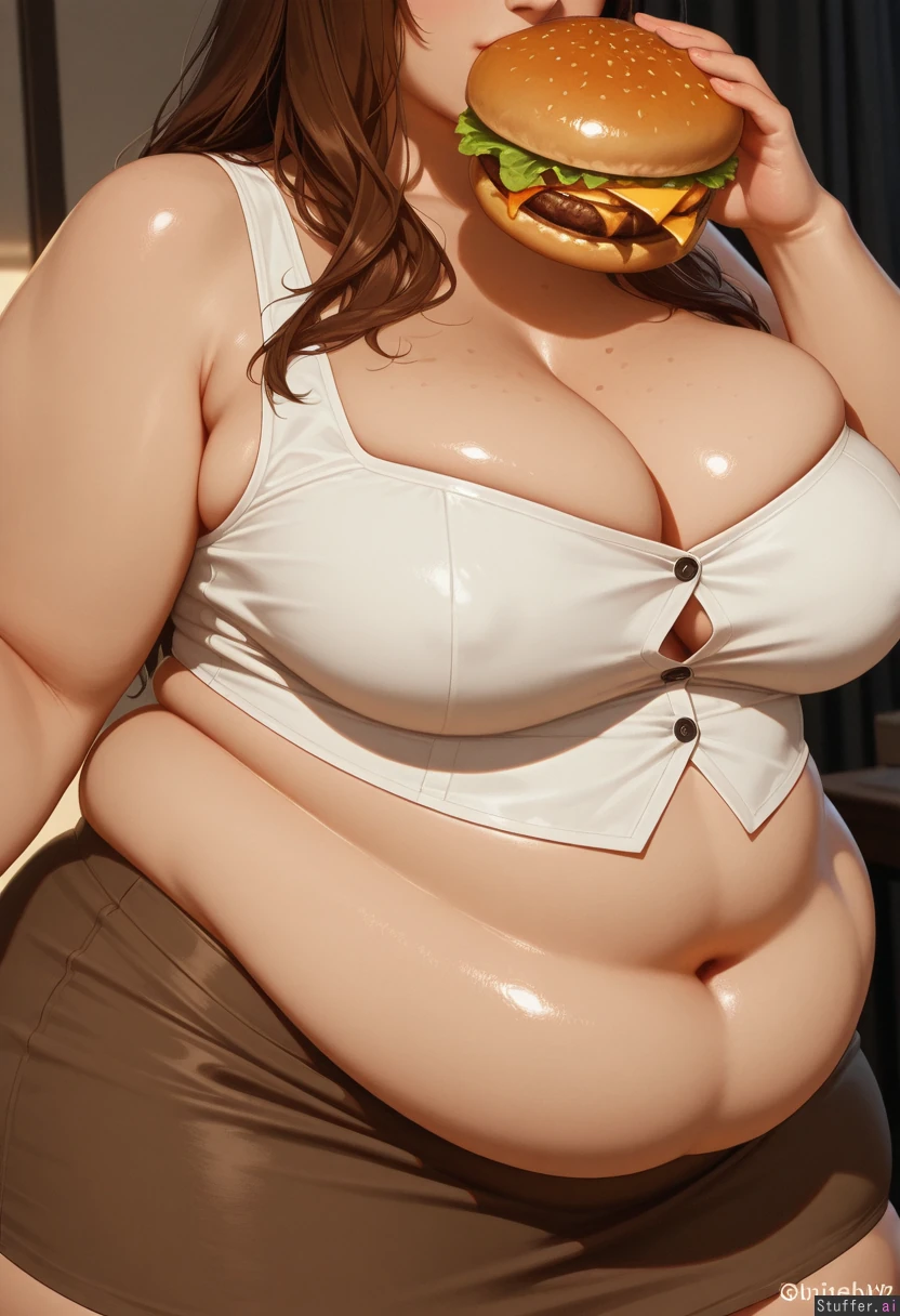 ((photorealistic)) (best quality), (high rating), c high res, detailed, ultra quality, ((high quality)), masterpiece, (ultra high resolution), resolution, 8k, uhd, highly detailed illustration, high rating, high contrast, fullHD, (((realistic, photorealistic))) Front on pose , (((close up shot of her torso, belly and breasts))), ((focus on her body, Not face)) Holding her fat belly and squishy love handles, (((beautiful hair)))), ((((narrow upper Body)))),((wide hips)), ((((fat arms)))),(((((fat obese legs))))), (((gigantic thick thighs))), cleavage)), ((big soft fat belly, squishy, chubby fat, overweight, out of shape, soft)), ((hanging chubby belly)) Tight white corset button up top, busty, long brown tight skirt netural lighting, bedroom setting, ((front view)), Standing, Seductively eating a burger