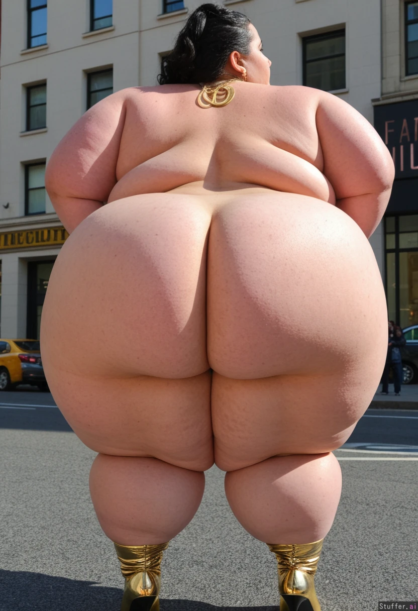 (Beautiful supermodel face), (gorgeous thick wavy black hair in a ponytail), ((large necklace, large hoop earrings, gold bracelets)) ((Very long stiletto nails)) (Round Fat face) ((spoiled bimbo)) ((Standing)) ((Tall boots)) (Walking in city) (((((Super Massive SSBBW immobile ultra hyper obese))))) Perfect anatomy (((back_fat, back rolls))) ((((Ssbbw blob fattened into a giant hyper obese blob, giant_flabby_ass, ultra_hyper_giant_circumference_ass, giant_hyper_ass, ass_width_10_times_wider_than_torso))))((((((((Ultra wide fat ass))))))))(((((Cellulite)))))((((Ultra Fat thighs)))((((Ultra Fat calves))))((((Fat rolls all over body))))(((((Immobile Blob)))))(((Extreme ass fat rolls)))