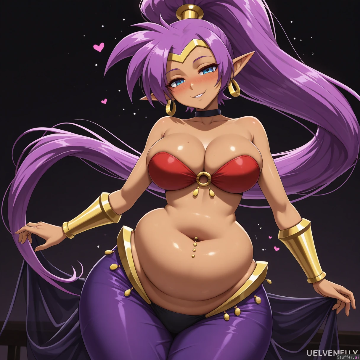 (((solo))), Shantae, ((brown skin)), ((long purple hair)), (((skinny upper torso))), (blue eyes), (((elongated upper abdomen))), large breasts, ((((highly detailed deep navel)))), (((unevenly wide hips))), (((belly blushing heavily))), (((thin upper abdomen))), (navel fetish), (((highly detailed soft pliable pudgy lower abdomen))), (((unevenly wide waist))), ((wearing very seductive belly dancer clothing)), ((smooth details)), ((uneven lower abdomen fat rolls)), (((smooth lineart))), (((dark bedroom background))), (((low lighting))), high quality art, ((((extremely drunk)))), (blushing), ((hiccups)), (((very curvy lower abdomen))), (((disproportionately very bottom belly heavy))), (((front view))), (((floating hearts around belly))), ((navel piercing)), ((dynamic pose))