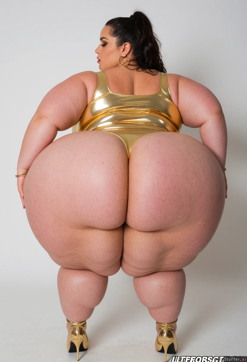 (Beautiful supermodel face), (gorgeous thick wavy black hair in a ponytail), ((large necklace, large hoop earrings, gold bracelets, anklet)), wearing skin tight dress. ((Very long stiletto nails)) (Round Fat face) ((spoiled bimbo)) ((Standing admiring herself)) ((Tall boots)) (Wearing a skin tight gold dress thats too small) (((((Ultra super hyper wide ass))))) ((((Massive SSBBW immobile ultra hyper obese))))(((Cellulite))) (Perfect anatomy) (back_fat, back rolls)(((Hyper Thigh fat))) ((fat rolls on legs and ass)) (((Ssbbw blob fattened into a giant hyper obese blob, too fat to move, giant_circumference_ass))) ((((((Ultra Wide hips))))))(((((Hyper Fat calves)))))