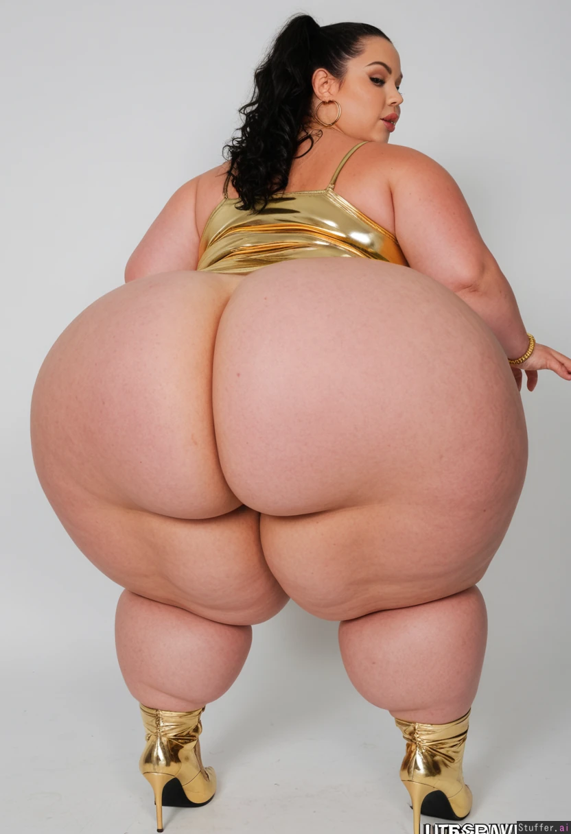 (Beautiful supermodel face), (gorgeous thick wavy black hair in a ponytail), ((large necklace, large hoop earrings, gold bracelets, anklet)), wearing skin tight dress. ((Very long stiletto nails)) (Round Fat face) ((spoiled bimbo)) ((Standing admiring herself)) ((Tall boots)) (Wearing a skin tight gold dress thats too small) ((((((Ultra super hyper wide ass)))))) ((((Massive SSBBW immobile ultra hyper obese))))(((Cellulite))) (Perfect anatomy) (back_fat, back rolls)(((Hyper Thigh fat))) (((fat rolls on legs and ass))) (((Ssbbw blob fattened into a giant hyper obese blob, too fat to move, hyper_giant_circumference_ass))) ((((((Ultra Wide hips))))))(((((Hyper Fat calves)))))(((Double width of ass)))