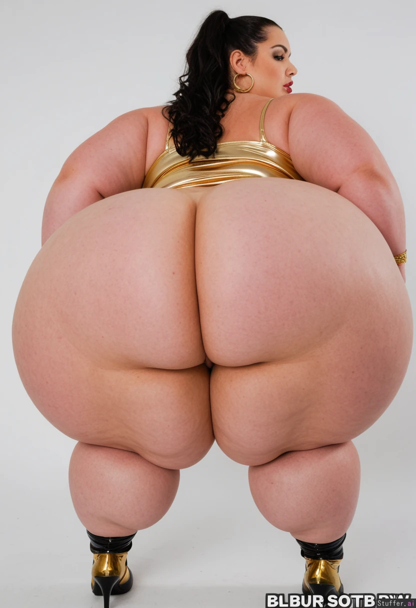 (Beautiful supermodel face), (gorgeous thick wavy black hair in a ponytail), ((large necklace, large hoop earrings, gold bracelets, anklet)), wearing skin tight dress. ((Very long stiletto nails)) (Round Fat face) ((spoiled bimbo)) ((Standing admiring herself)) ((Tall boots)) (Wearing a skin tight gold dress thats too small) ((((((Ultra super extreme hyper wide ass)))))) (((((Massive SSBBW immobile ultra hyper super obese)))))(((Cellulite))) (Perfect anatomy) (back_fat, back rolls)(((Hyper Thigh fat))) (((fat rolls on legs and ass))) ((((Ssbbw blob fattened into a giant hyper super obese blob, too fat to move, hyper_giant_circumference_ass)))) ((((((Extreme Ultra Wide hips))))))(((((Hyper thick Fat calves and cankles)))))(((Triple width of ass)))