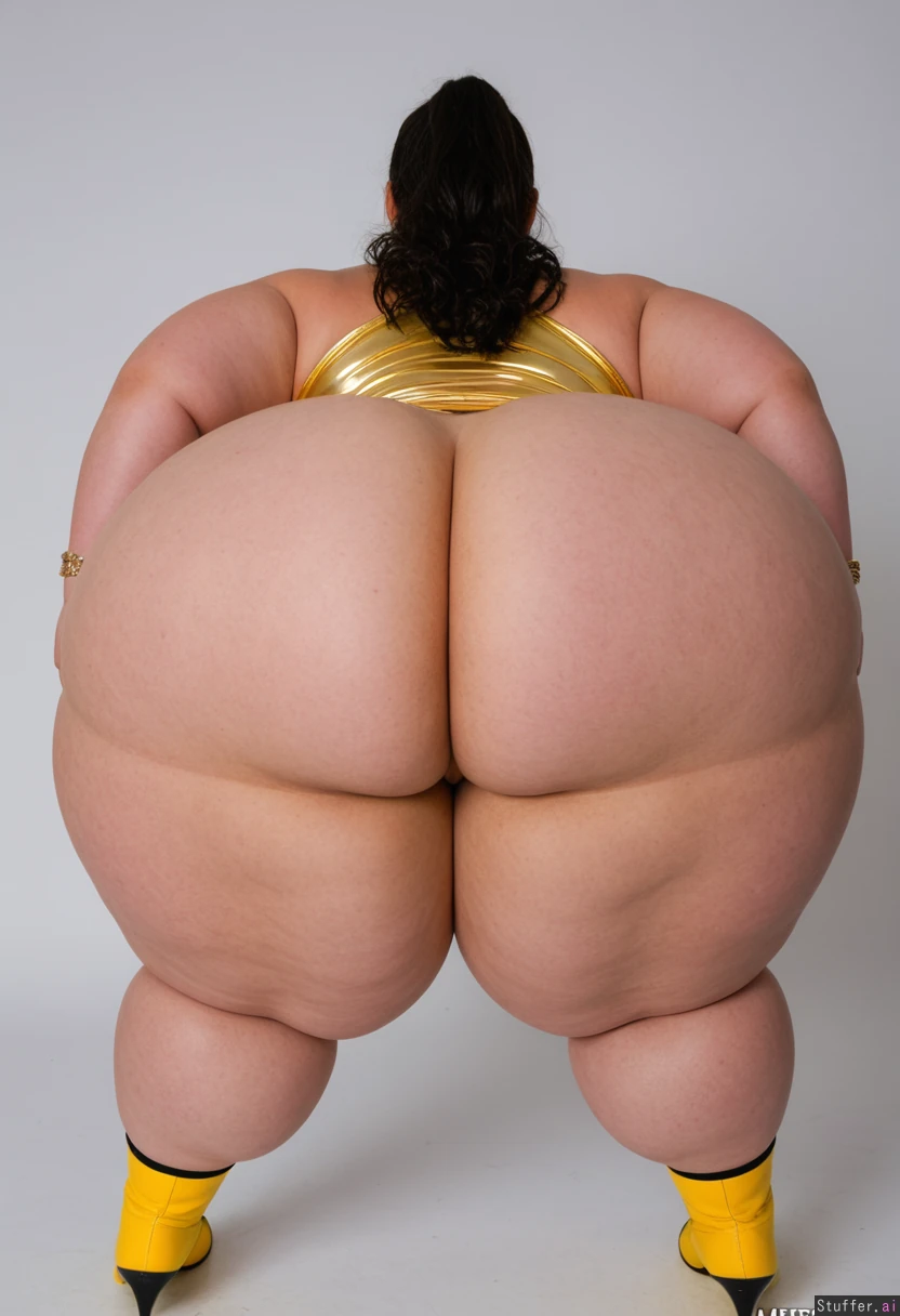 (Beautiful supermodel face), (gorgeous thick wavy black hair in a ponytail), ((large necklace, large hoop earrings, gold bracelets, anklet)), wearing skin tight dress. ((Very long stiletto nails)) (Round Fat face) ((spoiled bimbo)) ((Standing admiring herself)) ((Tall boots)) (Wearing a skin tight gold dress thats too small) ((((((((Ultra super extreme hyper wide ass)))))))) (((((Massive SSBBW immobile ultra hyper super obese)))))(((Cellulite))) (Perfect anatomy) (back_fat, back rolls)(((Hyper Thigh fat))) (((fat rolls on legs and ass))) ((((Ssbbw blob fattened into a giant hyper super obese blob, too fat to move, ultra_hyper_giant_circumference_ass)))) ((((((((Extreme Ultra hyper Wide hips))))))))((((((Hyperthick Fat calves and cankles))))))(((Quadruple width of ass)))(((((Super hyper morbidly obese)))))