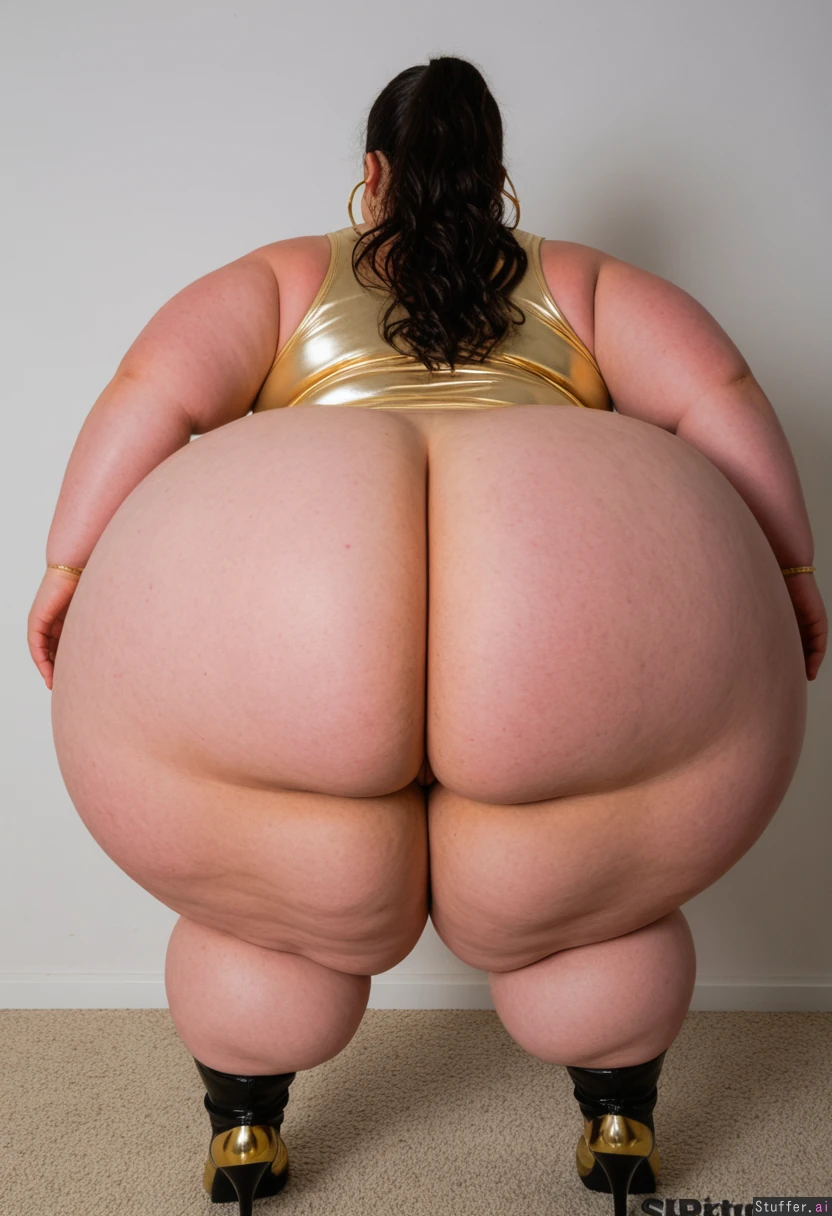 (Beautiful supermodel face), (gorgeous thick wavy black hair in a ponytail), ((large necklace, large hoop earrings, gold bracelets, anklet)), wearing skin tight dress. ((Very long stiletto nails)) (Round Fat face) ((spoiled bimbo)) ((Standing admiring herself)) ((Tall boots)) (Wearing a skin tight gold dress thats too small) ((((((Ultra super extreme hyper wide ass)))))) (((((Massive SSBBW immobile ultra hyper super obese)))))(((Cellulite))) (Perfect anatomy) (back_fat, back rolls)(((Hyper Thigh fat))) (((fat rolls on legs and ass))) ((((Ssbbw blob fattened into a giant hyper super obese blob, too fat to move, hyper_giant_circumference_ass)))) ((((((((Extreme Ultra hyper Wide hips))))))))(((((Ultra Hyper thick Fat calves and cankles)))))(((Lower body 25 times wider than upper body)))(((((((Super ultra hyper morbidly obese)))))))((((Hyper obese lower body))))((((Hips and ass as wide as room))))