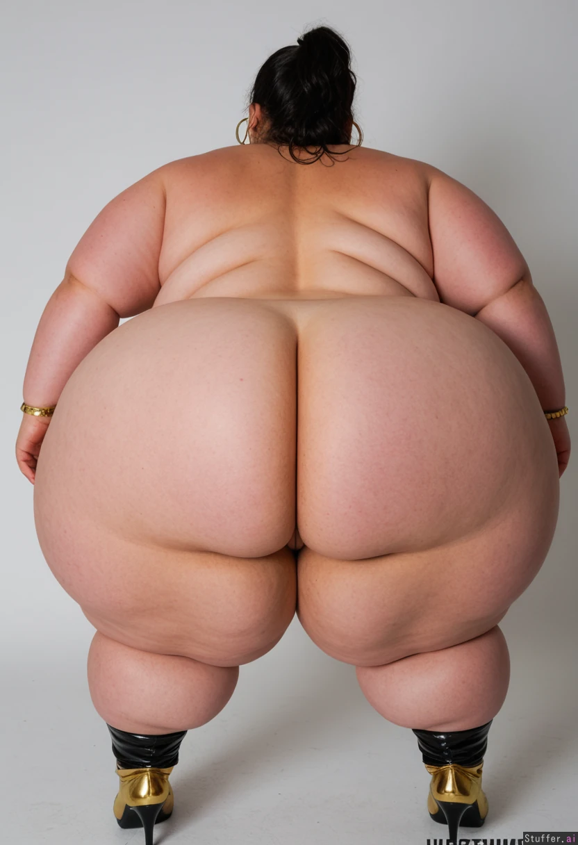 (Beautiful supermodel face), (gorgeous thick wavy black hair in a ponytail), ((large necklace, large hoop earrings, gold bracelets, anklet)), wearing skin tight dress. ((Very long stiletto nails)) (Round Fat face) ((spoiled bimbo)) ((Standing admiring herself)) ((Tall boots)) (Wearing a skin tight gold dress thats too small) ((((((Ultra super extreme hyper wide ass)))))) (((((Massive SSBBW immobile ultra hyper super obese)))))(((Cellulite))) (Perfect anatomy) (back_fat, back rolls)(((Hyper wide Thigh fat))) (((fat rolls on legs and ass))) ((((Ssbbw blob fattened into a giant hyper super obese blob, too fat to move, hyper_giant_circumference_ass)))) ((((((((Extreme Ultra hyper Wide hips))))))))(((((Ultra Hyper thick Fat calves and cankles)))))((((((((Lower body 25 times wider than upper body))))))))(((((((Super ultra hyper morbidly obese)))))))((((Hyper obese lower body))))((((Fat overflowing))))) ((immobile)) ((((Ultra_oversized_immobile_morbid_obese_ssbbw_mega_blob:2.1, sprawling_gigantic_oversized_adipose_ass:2.1, (((oversized obese ankles and feet:1.7))), (gigantic_fat_oversized_adipose_legs:1.8), (gigantic_fat_oversized_adipose_calves:1.8),