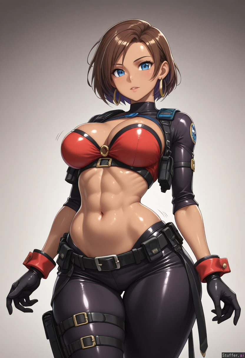 ((((solo)))), (((very accurate fused Jill Valentine Shantae amalgamation with perfect mix of both Shantae and Jill Valentine physical characteristics))), tomboy appearance, ((fair brown skin)), (((fusion))), large breasts, (((very long brown and purple highlighted hair))), (tall), ((elongated body)), (small blue eyes), large breasts, ((((highly detailed deep navel)))), (((highly detailed soft stomach))), (((wide hips))), (((wide waist))), (((wearing tactical blue harem outfit))), (red crop top), (motion lines), smooth details, (nightime background), high quality art, golden glove cuffs, black gloves, thick thighs, ((detailed abs)), realistic proportions, (((resident evil artstyle))), ((hoop earrings)), ((arched back))