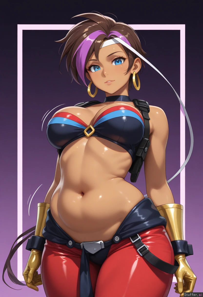 ((((solo)))), (((very accurate fused Jill Valentine Shantae amalgamation with perfect blend of both Shantae and Jill Valentine physical characteristics))), confident, tomboy appearance, ((fair brown skin)), (((fusion))), large breasts, (((very long brown and purple highlighted hair))), (tall), ((elongated body)), (small blue eyes), large breasts, ((((highly detailed deep navel)))), (((highly detailed soft stomach))), (((wide hips))), (((wide waist))), (((wearing tactical blue harem outfit))), (red crop top), (motion lines), smooth details, (nightime background), high quality art, golden glove cuffs, black gloves, thick thighs, ((slight belly fat)), realistic proportions, (((resident evil artstyle))), ((hoop earrings)), ((arched back))