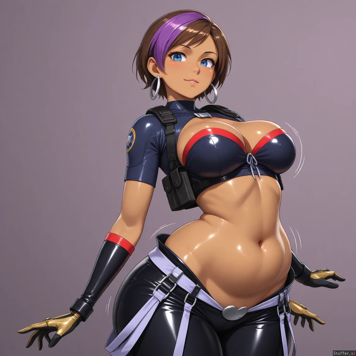 ((((solo)))), (((very accurate fused Jill Valentine Shantae amalgamation with perfect blend of both Shantae and Jill Valentine physical characteristics))), confident, tomboy appearance, ((fair brown skin)), (((fusion))), large breasts, (((very long brown and purple highlighted hair))), (tall), ((elongated body)), (small blue eyes), large breasts, ((((highly detailed deep navel)))), (((highly detailed soft stomach))), (((wide hips))), (((wide waist))), (((wearing tactical blue harem outfit))), (red crop top), (motion lines), smooth details, (nightime background), high quality art, golden glove cuffs, black gloves, thick thighs, ((slight belly fat)), realistic proportions, (((resident evil artstyle))), ((hoop earrings)), ((arched back))