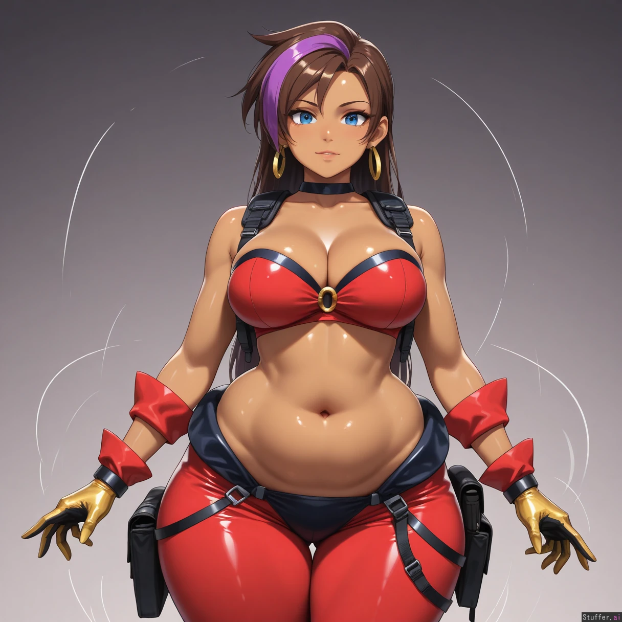 ((((solo)))), (((very accurate fused Jill Valentine Shantae amalgamation with perfect blend of both Shantae and Jill Valentine physical characteristics))), confident, tomboy appearance, ((fair brown skin)), (((fusion))), large breasts, (((very long brown and purple highlighted hair))), (tall), ((elongated body)), (small blue eyes), large breasts, ((((highly detailed deep navel)))), (((highly detailed soft stomach))), (((wide hips))), (((wide waist))), (((wearing tactical blue harem outfit))), (red crop top), (motion lines), smooth details, (nightime background), high quality art, golden glove cuffs, black gloves, thick thighs, (slight belly fat), realistic proportions, (((resident evil artstyle))), ((hoop earrings))