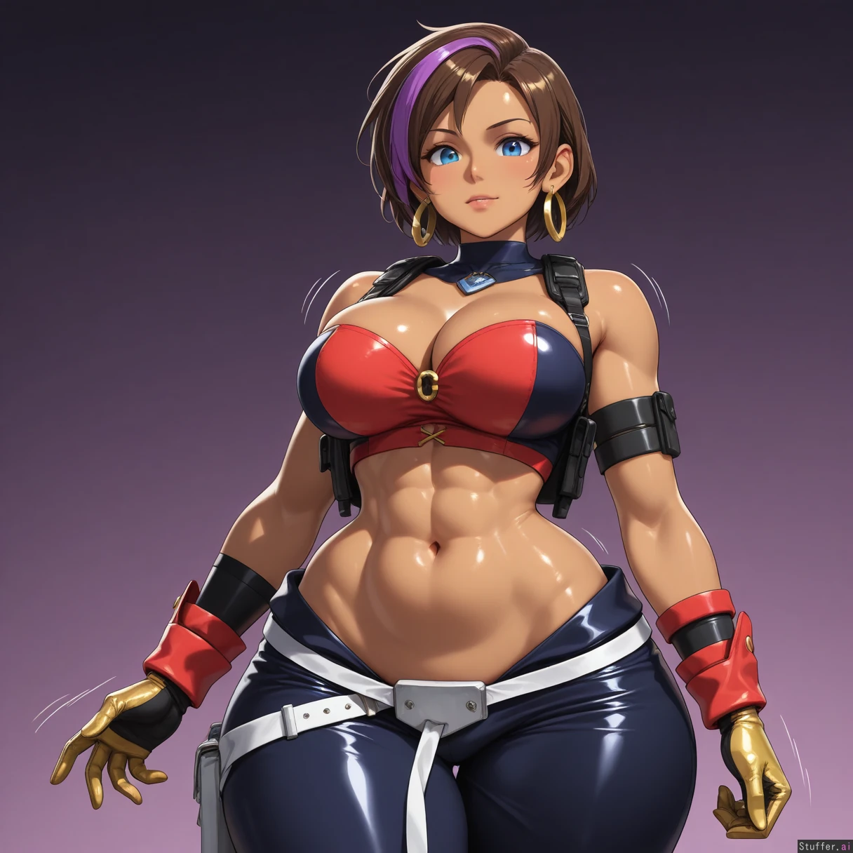 ((((solo)))), (((very accurate fused Jill Valentine Shantae amalgamation with perfect blend of both Shantae and Jill Valentine physical characteristics))), confident, tomboy appearance, ((fair brown skin)), (((fusion))), large breasts, (((very long brown and purple highlighted hair))), (tall), ((elongated body)), (small blue eyes), large breasts, ((((highly detailed deep navel)))), (((highly detailed soft stomach))), (((wide hips))), (((wide waist))), (((wearing tactical blue harem outfit))), (red crop top), (motion lines), smooth details, (nightime background), high quality art, golden glove cuffs, black gloves, thick thighs, (slight lower abdomen fat), ((abs)), realistic proportions, (((resident evil artstyle))), ((hoop earrings))