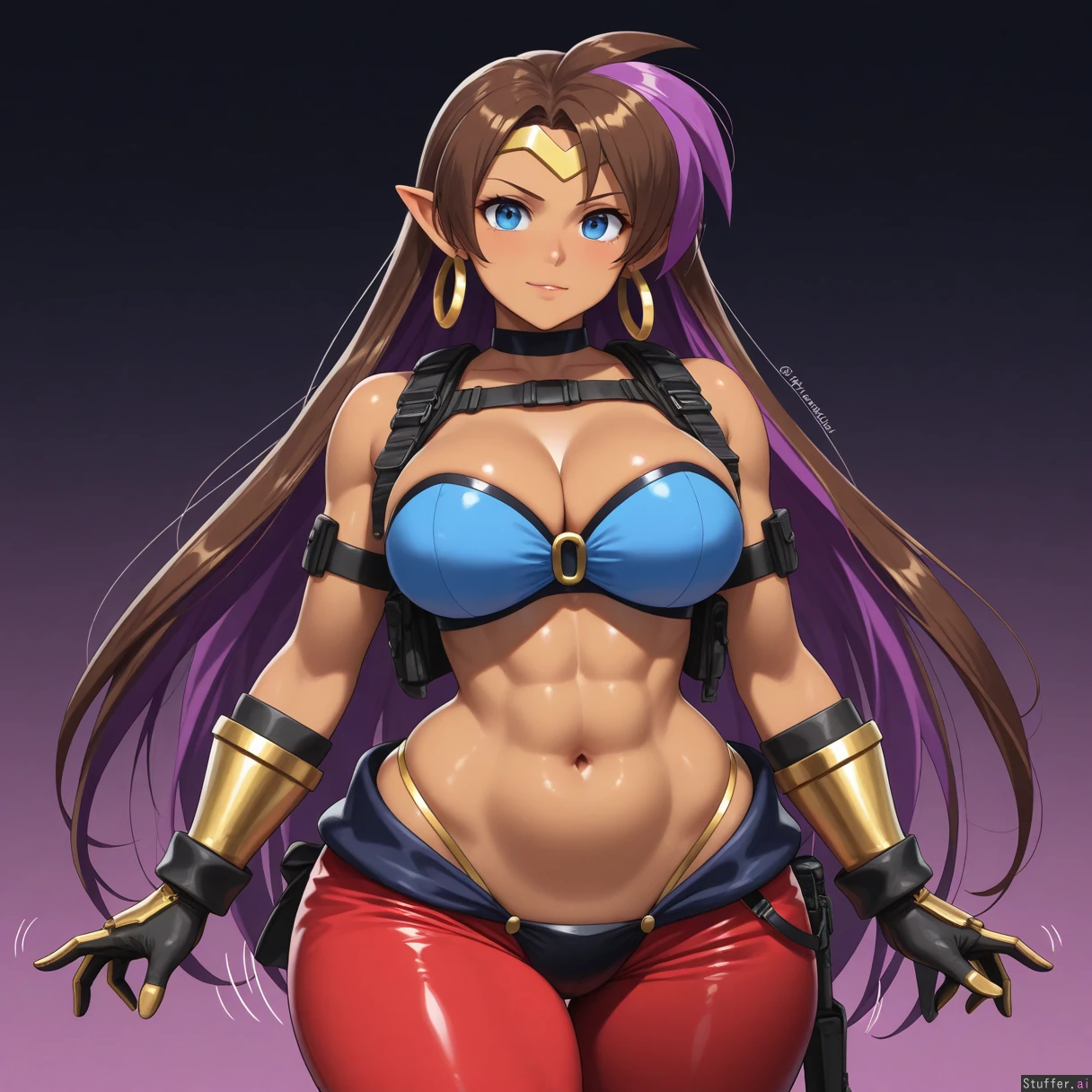 ((((solo)))), (((very accurate fused Jill Valentine Shantae amalgamation with perfect blend of both Shantae and Jill Valentine physical characteristics))), confident, tomboy appearance, ((fair brown skin)), (((fusion))), large breasts, (((very long brown and purple highlighted hair))), (tall), ((elongated body)), (small blue eyes), large breasts, ((((highly detailed deep navel)))), (((highly detailed soft stomach))), (((wide hips))), (((wide waist))), (((wearing tactical blue harem outfit))), (red crop top), (motion lines), smooth details, (nightime background), high quality art, golden glove cuffs, black gloves, thick thighs, (slight lower abdomen fat), ((abs)), realistic proportions, (((resident evil artstyle))), ((hoop earrings)), dark background
