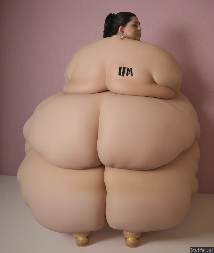 (Beautiful supermodel face), (gorgeous thick wavy black hair in a ponytail), ((large necklace, large hoop earrings, gold bracelets)) ((Very long stiletto nails)) (Round Fat face) ((spoiled bimbo)) ((Standing)) ((Tall boots)) (((((Massive immobile ultra hyper obese))))) ((Perfect anatomy)) (((back_fat, back rolls))) ((((blob fattened into a giant hyper obese immobile blob, giant_round_ass, giant_circumference_ass, giant_hyper_ass, ass_wider_than_anything))))((((((((((Ultra hyperwide fat ass))))))))))(((((Cellulite)))))((Ultra Fat thighs))(((((((((Fat rolls)))))))))((Stretch marks))