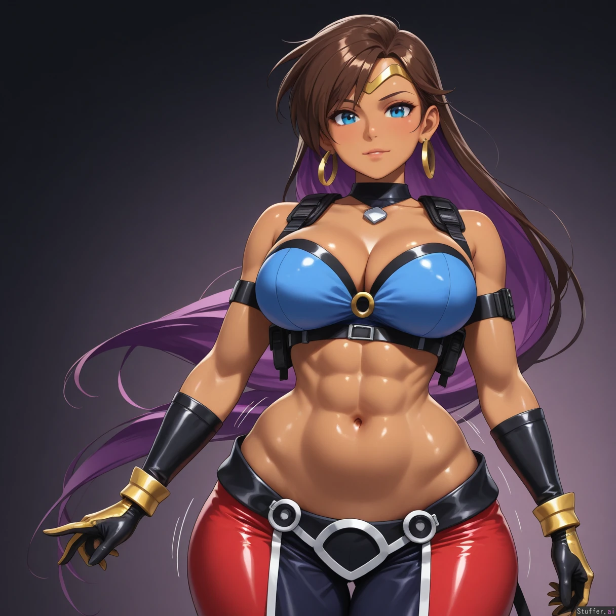 ((((solo)))), (((very accurate fused Jill Valentine Shantae amalgamation with perfect blend of both Shantae and Jill Valentine physical characteristics))), confident, tomboy appearance, ((fair brown skin)), (((fusion))), large breasts, (((very long brown and purple highlighted hair))), (tall), ((elongated body)), (small blue eyes), large breasts, ((((highly detailed deep navel)))), (((highly detailed soft stomach))), (((wide hips))), (((wide waist))), (((wearing tactical blue harem outfit))), (red crop top), (motion lines), smooth details, (nightime background), high quality art, golden glove cuffs, black gloves, thick thighs, (slight lower abdomen fat), ((highly detailed abs)), realistic proportions, (((resident evil artstyle))), ((hoop earrings)), dark background