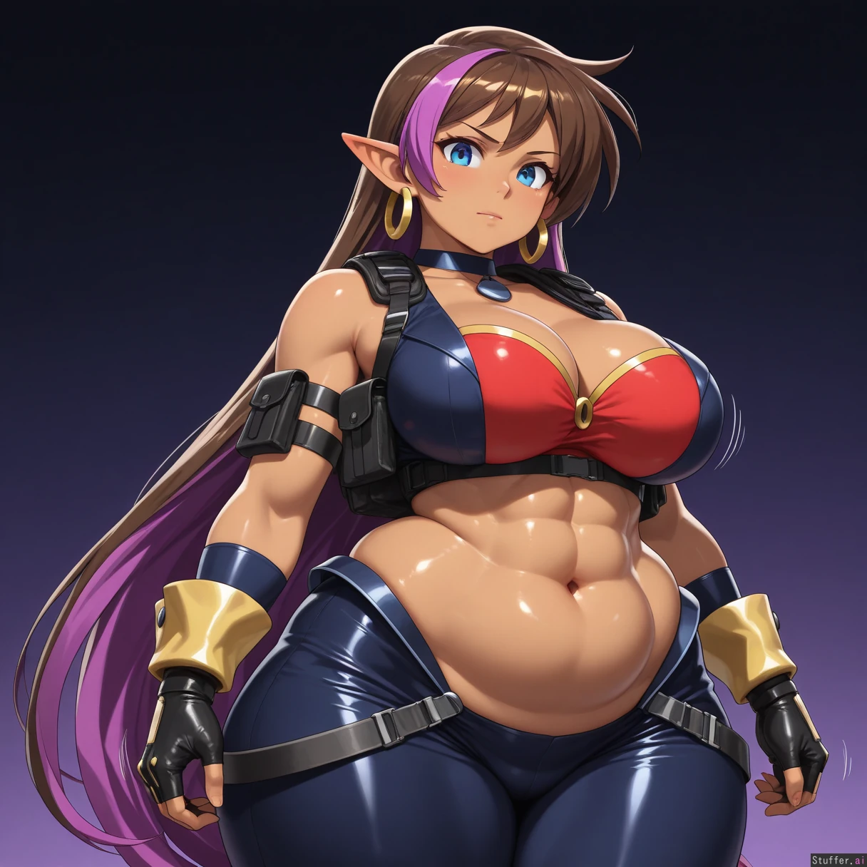 ((((solo)))), (((very accurate fused Jill Valentine Shantae amalgamation with perfect blend of both Shantae and Jill Valentine physical characteristics))), confident, tomboy appearance, ((fair brown skin)), (((fusion))), large breasts, (((very long brown and purple highlighted hair))), (tall), ((elongated body)), (small blue eyes), large breasts, ((((highly detailed deep navel)))), (((highly detailed soft stomach))), (((wide hips))), (((wide waist))), (((wearing tactical blue harem outfit))), (red crop top), (motion lines), smooth details, (nightime background), high quality art, golden glove cuffs, black gloves, thick thighs, ((slight lower abdomen fat)), ((highly detailed rough abs)), realistic proportions, (((resident evil artstyle))), ((hoop earrings)), dark background