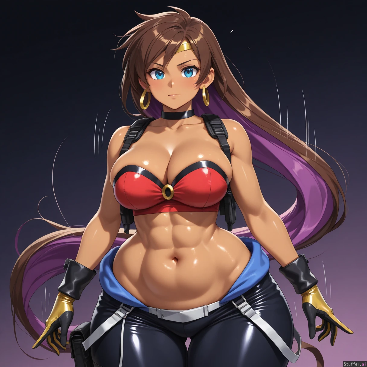 ((((solo)))), (((very accurate fused Jill Valentine Shantae amalgamation with perfect blend of both Shantae and Jill Valentine physical characteristics))), confident, tomboy appearance, ((fair brown skin)), (((fusion))), large breasts, (((very long brown and purple highlighted hair))), (tall), ((elongated body)), (small blue eyes), large breasts, ((((highly detailed deep navel)))), (((highly detailed soft stomach))), (((wide hips))), (((wide waist))), (((wearing tactical blue harem outfit))), (red crop top), (motion lines), smooth details, (nightime background), high quality art, golden glove cuffs, black gloves, thick thighs, ((lower abdomen fat)), ((highly detailed rough abs)), realistic proportions, (((resident evil artstyle))), ((hoop earrings)), dark background