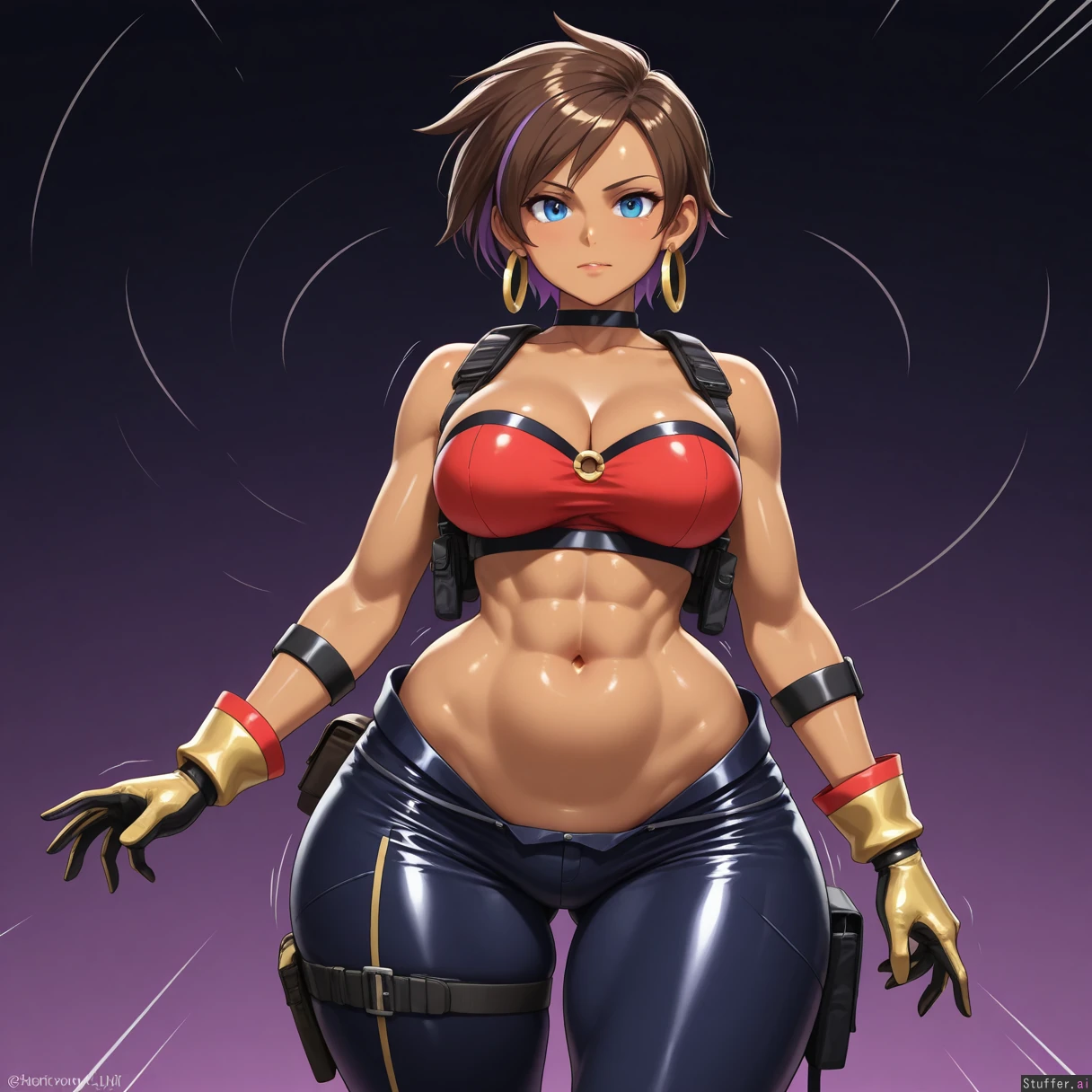 ((((solo)))), (((very accurate fused Jill Valentine Shantae amalgamation with perfect blend of both Shantae and Jill Valentine physical characteristics))), confident, tomboy appearance, ((fair brown skin)), (((fusion))), large breasts, (((very long brown and purple highlighted hair))), (tall), ((elongated body)), (small blue eyes), large breasts, ((((highly detailed deep navel)))), (((highly detailed soft stomach))), (((wide hips))), (((wide waist))), (((wearing tactical blue harem outfit))), ((wearing red tube top)), (motion lines), smooth details, (nightime background), high quality art, golden glove cuffs, black gloves, thick thighs, ((lower abdomen fat)), ((highly detailed rough abs)), realistic proportions, (((resident evil artstyle))), ((hoop earrings)), dark background
