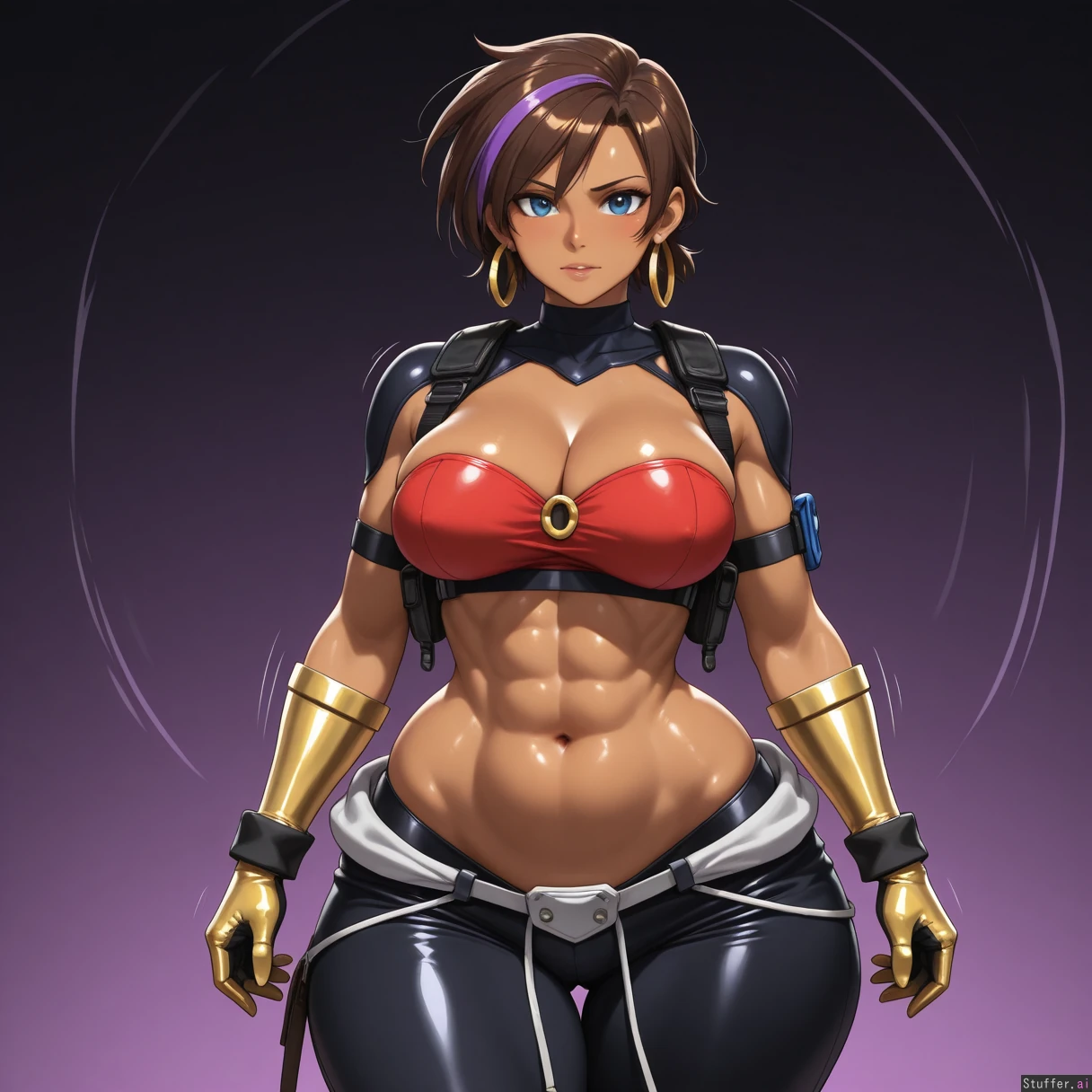 ((((solo)))), (((very accurate fused Jill Valentine Shantae amalgamation with perfect blend of both Shantae and Jill Valentine physical characteristics))), confident, tomboy appearance, small ponytail, ((fair brown skin)), (((fusion))), large breasts, (((very long brown and purple highlighted hair))), (tall), ((elongated body)), (small blue eyes), large breasts, ((((highly detailed deep navel)))), (((highly detailed soft stomach))), (((wide hips))), (((wide waist))), (((wearing tactical blue harem outfit))), ((wearing red tube top)), (motion lines), smooth details, (nightime background), high quality art, golden glove cuffs, black gloves, thick thighs, ((lower abdomen fat)), ((highly detailed rough abs)), realistic proportions, (((resident evil artstyle))), ((hoop earrings)), dark background
